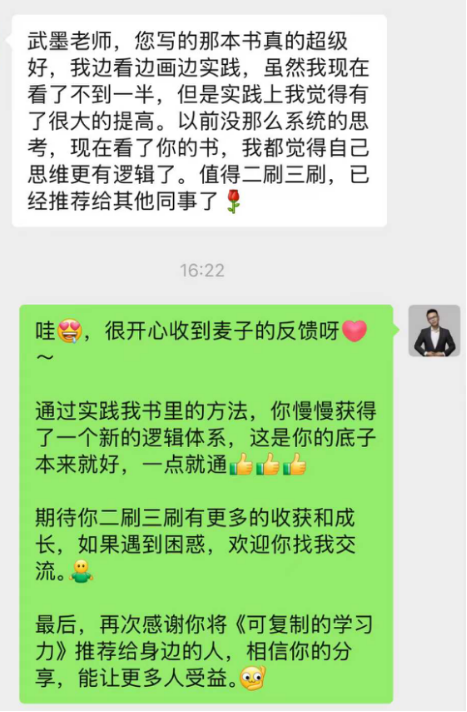 有位读者看完书后就说:“江武墨老师,您写的那本书真的超级好,我边看边画边实践,虽然我现在看了不到一半,但是实践上我觉得有了很大的提高。以前没那么系统的思考,现在看了你的书,我都觉得自己思维更有逻辑了。值得二刷三刷,已经推荐给其他同事了。”