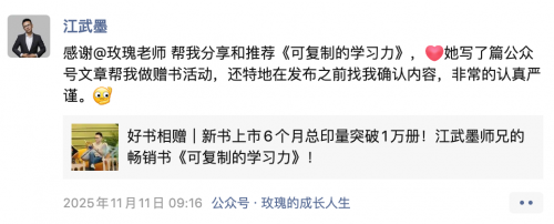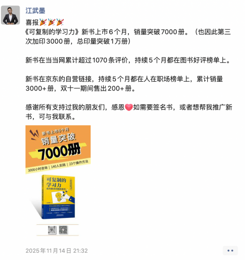 11月14日,江武墨发了一条朋友圈,庆贺自己新书《可复制的学习力:成为解决问题的高手》上市6个月,销量突破7000册,总印量达到1万册。