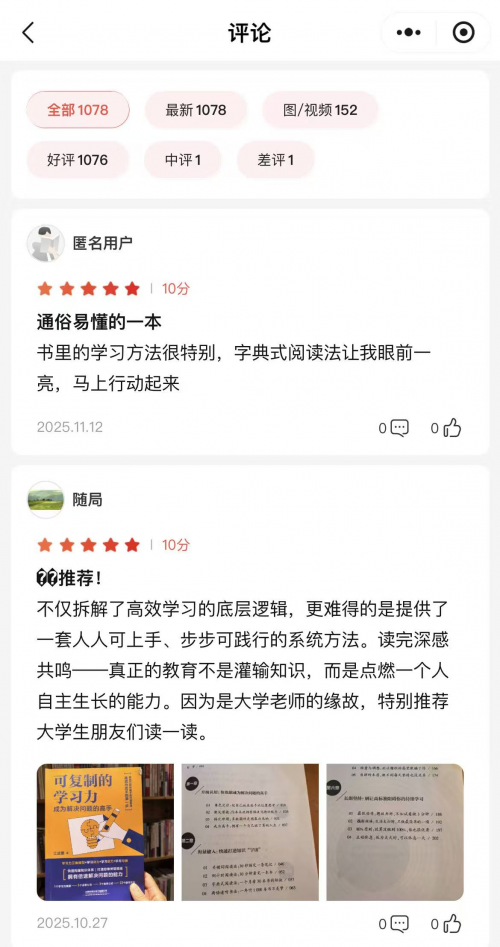 据悉,目前《可复制的学习力》在当当网评价累计超过1070条,连续5个月都登上当当网“好评榜”榜单;在京东的自营链接连续5个月都登上“人在职场”榜单。